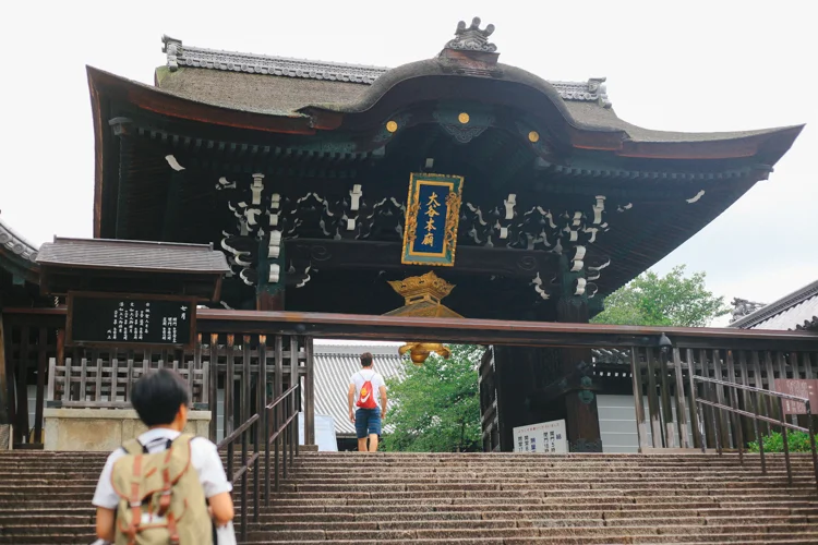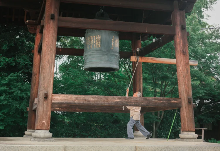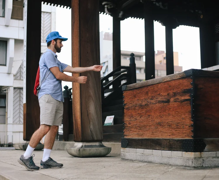Zac throwing some change into a wooden box right outside one of Kyoto's oldest temples.